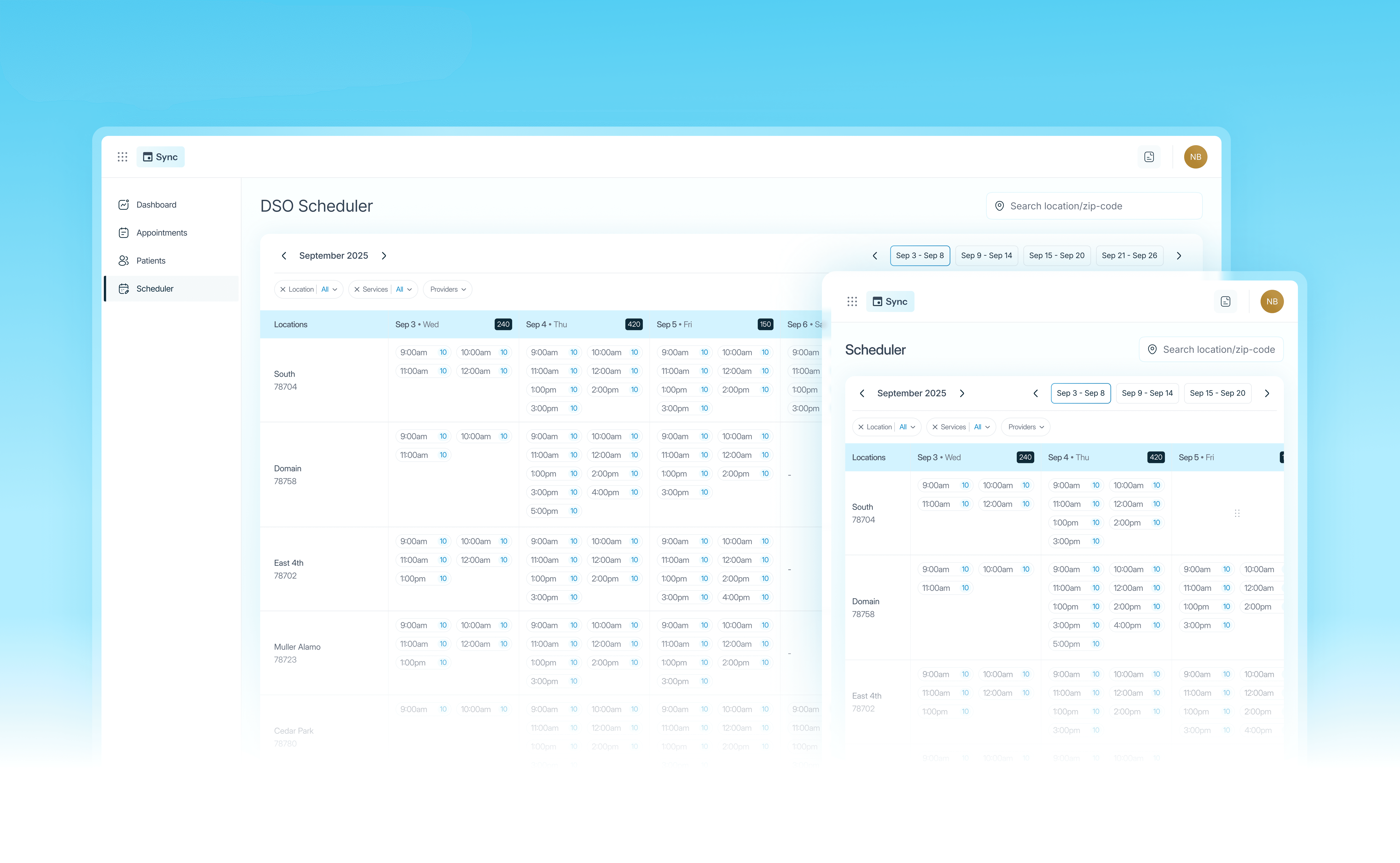 Sync – Provider Portal, a scheduling platform by Subscribili, is a web application designed to streamline dental appointment workflows. It integrates with four leading EHR/PMS systems in the dental industry. As the second Product Designer, I played a key role in shaping the product experience and establishing a scalable design system despite early constraints.